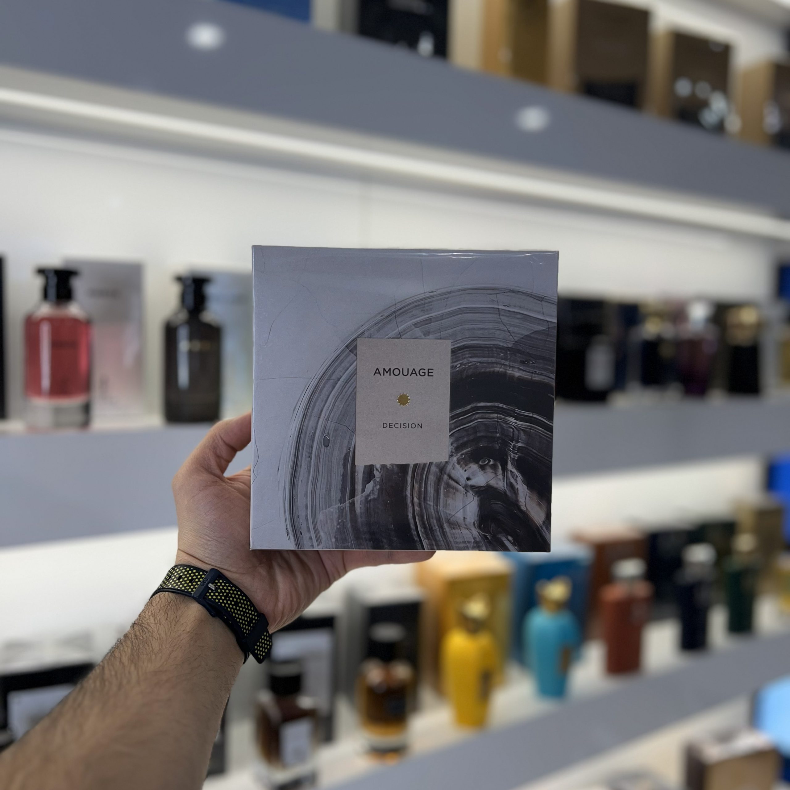 عطر Amouage Decision از برند لوکس Amouage یک رایحه‌ی چوبی-گرم، ادویه‌ای و عنبری است که با ترکیب پرتقالی و تندِ هل و فلفل صورتی شروع می‌شود، سپس با کندر و مر هویتی عمیق و گرم می‌یابد و در پایان با وانیل، سدر و پچولی به حس تمیز، مطمئن و لوکس می‌رسد.